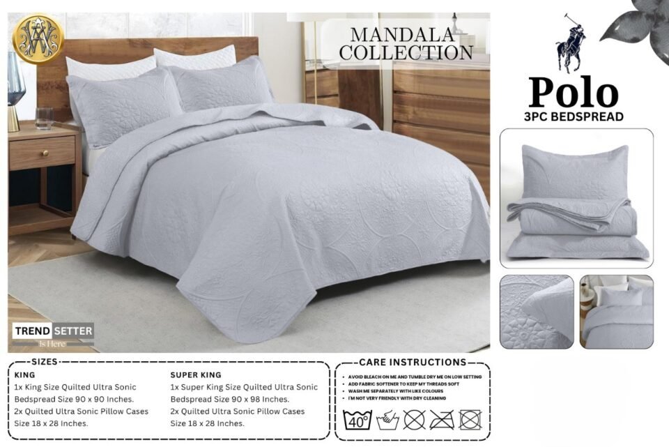 Elevate your bedroom with the Polo Mandala Collection. This premium 3-piece ultrasonic quilted bedspread set offers a sophisticated embossed design and a soft, lightweight feel. Available in 10 stunning colors, it’s the perfect blend of luxury and comfort for King and Super King beds.